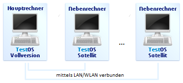 | Auf dem Hauptrechner wird die Probeversion oder eine der beiden Vollversionen installiert. Hier werden die Daten verwaltet. Auf dem Hauptrechner stehen alle Funktionen von TestOS zur Verfügung. | Auf beliebig vielen weiteren Rechnern wird die Satellitenversion von TestOS installiert. Wenn die Datenbank auf dem Hauptrechner aktiv ist können parallel auf den Satellitenrechnern Testsitzungen durchgeführt werden. Die Daten werden dabei auf dem Hauptrechner aufgezeichnet - es existiert so nur eine einzige Datenbank mit den sensiblen Patientendaten. |