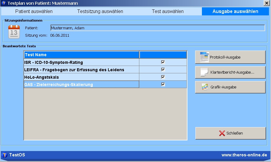 - Gleich mehrere Tests aufrufen: Für jeden Patienten können Testlisten für verschiedene Anlässe (z.B. Eingangsuntersuchung, Ergebniskontrolle, Prozess-Probleme, Depressive Patienten) vorbereitet und gleich als Einheit aufgerufen werden.